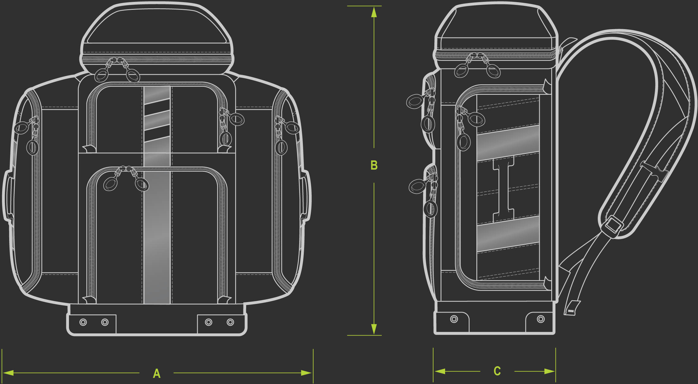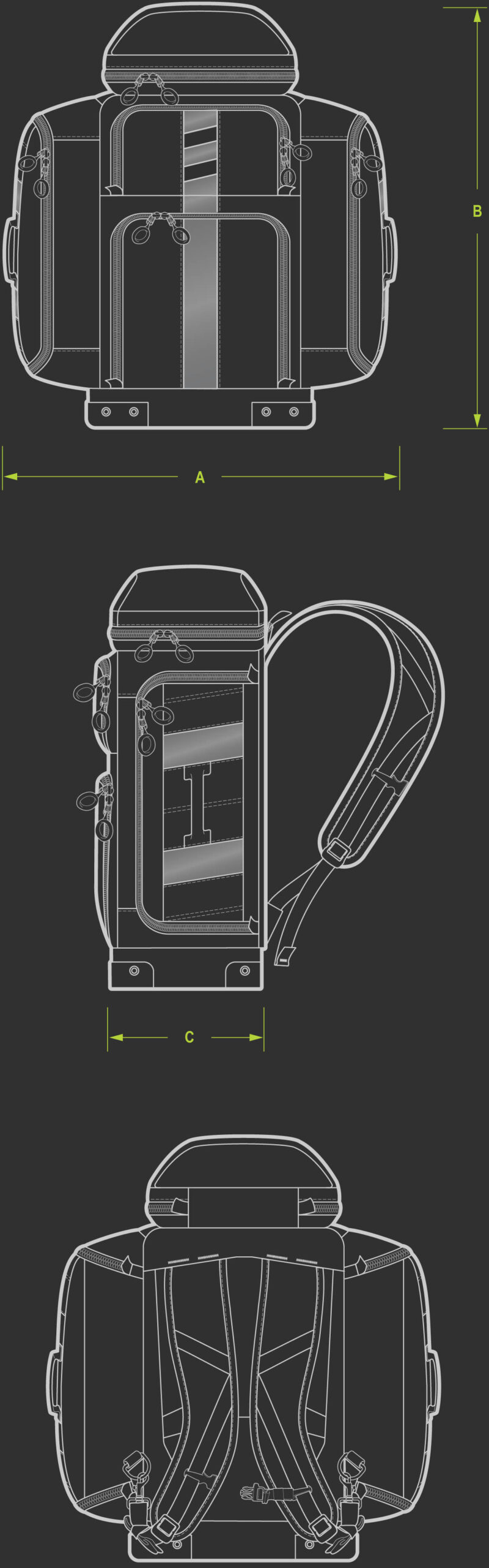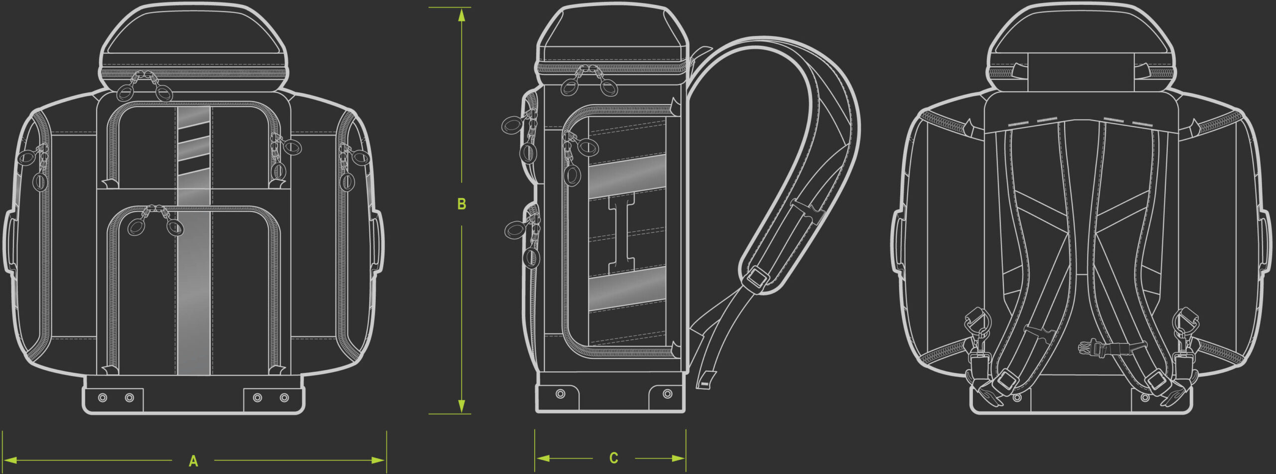 An integrated aluminum frame provides internal stability without bulk. It allows the shoulder straps to part easily for unencumbered access, while maintaining balance and comfort under heavy load.