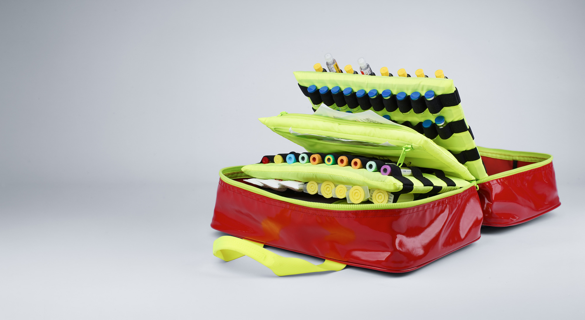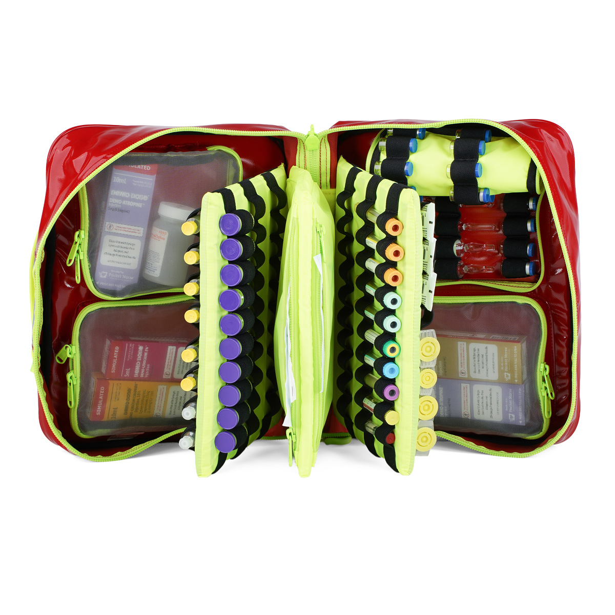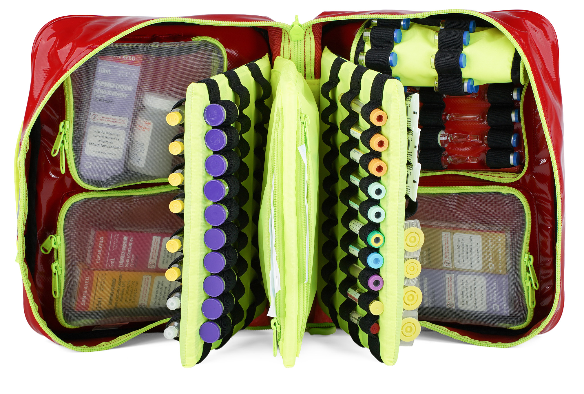 Fold-out design delivers complete visibility and access to all stored items, empowering clinicians to act decisively under pressure. Removable center dividers organize syringes, vials, and IV therapy equipment, while mesh pockets and elastic holsters keep contents secure during transport.