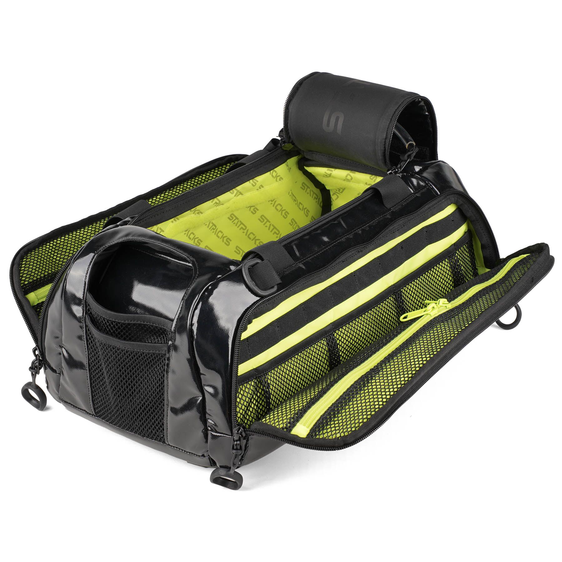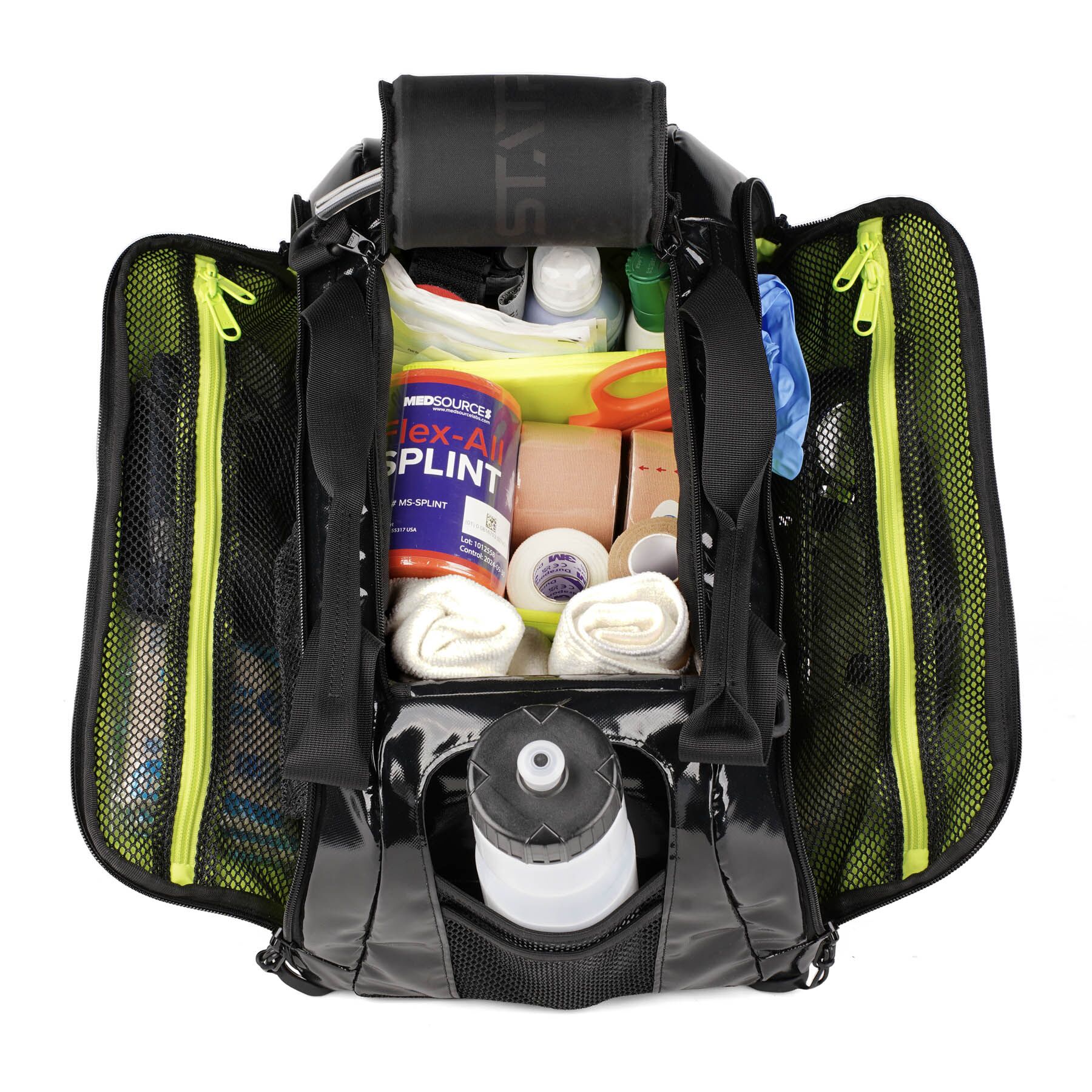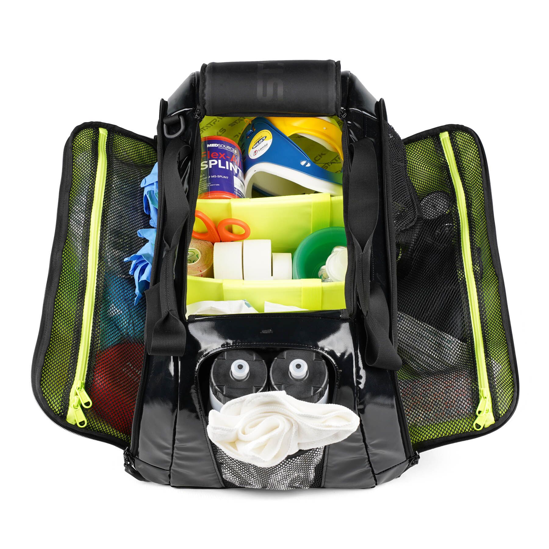 Fluorescent yellow lining and clear mesh pockets accelerate identification in low-light and high-stress settings.